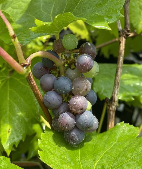 山葡萄(ヤマブドウ):ポットレッドワンは鉢植えなどで栽培が可能な欧州系の実生選抜品種です。果実の大きさはデラウエア程度で甘さも香りも濃厚でジュースやジャムにも最適です。