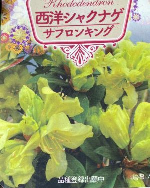 西洋石楠花(西洋シャクナゲ)サフロンキングは、人気の石楠花「サフロンクイーン」を親にもち、親のサフロンクイーンよりも、花弁、葉ともに厚くて大きく、耐寒性も改良された丈夫な黄花石楠花です。