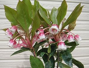中国原産の常緑性ドウダンツツジで、別名:ピンクシャンデリア とも呼ばれています。蝋細工のような花がとても魅力的な品種。