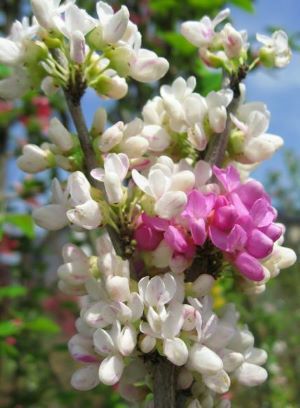 葉はハート型で、早春に咲く花は、白色に赤紫色が入る絞り咲き品種で美しい花を咲かせます。(咲分けハナズオウ)