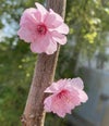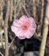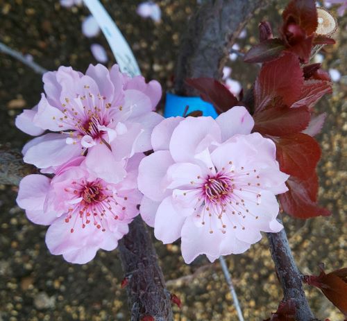 葉が濃い紅色(銅葉)になる珍しい花梅。八重咲き紅花(薄紅花)を咲かせる、詳細不明な花梅。
