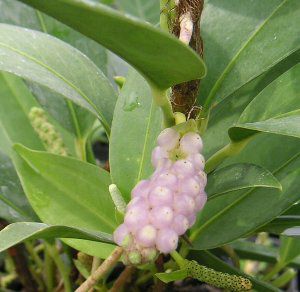 ブドウの様な薄い紫色の肉穂花序に着く果実が特徴。