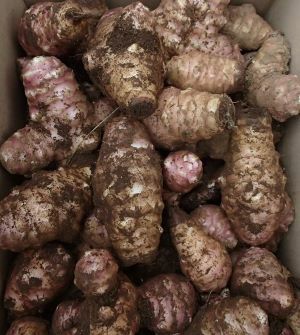 寒くなり、地上の葉や茎が枯れたら、地中のショウガのような芋を収穫します。
