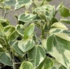 最近人気ですが、流通量の少ない希少種、ルンフィーの斑入り品種です。白斑ですが、光の加減では黄色く見える場合もあります。個体差もあるようです。 インドボダイジュに似て、細く尖ったような葉先を持ちますが、印度菩提樹ほど長く伸びてはいません。