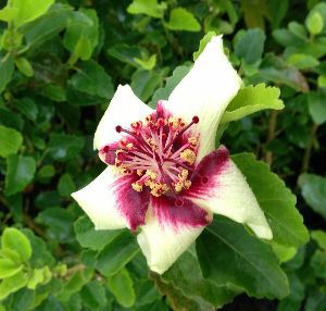 ハイビスカス インスラリス:オーストラリア原産の絶滅危惧種。葉は小さく卵型で縁に波状の鋸歯が有り、花は淡い黄白色で、中央は紅色、直径は10センチほどです。通常花は冬に開花します!