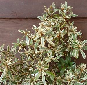ツツジ科 常緑低木 *金采の枝変わり、花は小輪赤花(シベ咲き)、葉は緑に白覆輪入り、