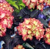 アジサイ ライトマイファイヤー:ライムグリーン~花弁の縁に赤いぼかしが入るバイカラー咲きの紫陽花。葉もシックな黒~銅茶色に変化する。