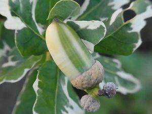 葉と同じようにドングリにも斑が入って、緑と白のきれいな縦縞模様になります。(斑入りドングリ)
