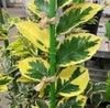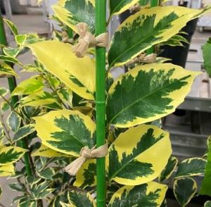 斑入り葉スダジイ(外斑)安行イエロー:本品種は、葉の外側に黄色~クリーム色の斑が入っており、とても明るい雰囲気を醸し出してくれます。 暗い場所に耐えて問題なく生育しますので、建物の北側など陽の当たらない場所などを、明るくするのにぴったりの植物です。