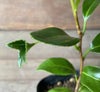 梵天赤椿(ボンテンアカツバキ)は、まるで金魚の尾びれのような葉がぶら下がる珍しい品種です。(変化葉椿)