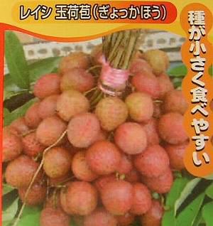 ライチ(茘枝、レイシ) は、中国原産の常緑樹で、果実は白色半透明でジューシーな果肉がとても美味しく、あの楊貴妃も愛した果実として有名です。レイシ(玉荷苞)は、果実の大きさが直径3センチ程度で糖度は15度程度で安定しとても美味しいと評判なライチです。また種が小さく、可食部分が多いためとても食べやすいと評判な品種です。