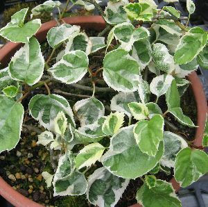 白覆輪イワガラミ:紫陽花は、幹や枝から気根を出して樹木や岩崖に付着し絡み付きながら這い上がる紫陽花です。美しい白色の覆輪が葉に入るイワガラミです。花は白花。
