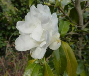 白花孔雀椿(クジャクツバキ)は、花は、白色で八重咲き。白孔雀