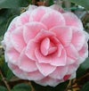西洋椿トムタム、花は千重咲き、桃紅地で白覆輪。中輪品種です。