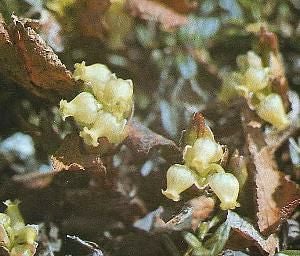 北海道及び本州の中部以北の高山帯に自生するツツジで、高さ5センチ程度の小低木。花は枯れた前年の葉に包まれた状態で、クリーム色の壺型の小花が数個枝先につく。