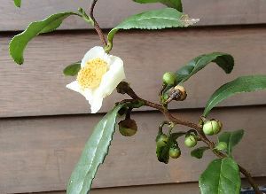 お茶の木(オチャノキ)は、椿の仲間で古くから飲まれてるお茶の原料として利用されています。