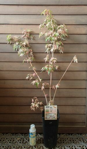 葉は春の新芽に美しい散り斑などが入り、葉の先がピンクに色づきます。夏は薄い緑色、秋は黄色に変化するモミジです。