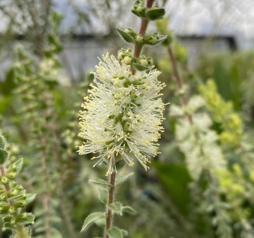 メラレウカ センテッドペーパーバークは、初夏に芳香のあるクリーム色の円柱状の花を多く付けます。剪定に強く、刈り込むとよく枝を出します。