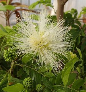 カリアンドラ・ハエマトケファラ(白花)は、ホワイトパウダーパフ、パウダーツリーとも呼ばれ、お化粧等で使うパフのような可愛いふさふさした花を咲かせます。