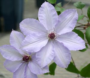 花は涼しげな藤色、花芯の赤色と相まって、原種「カザグルマ」らしい、飾らないシンプルな美しさがある。